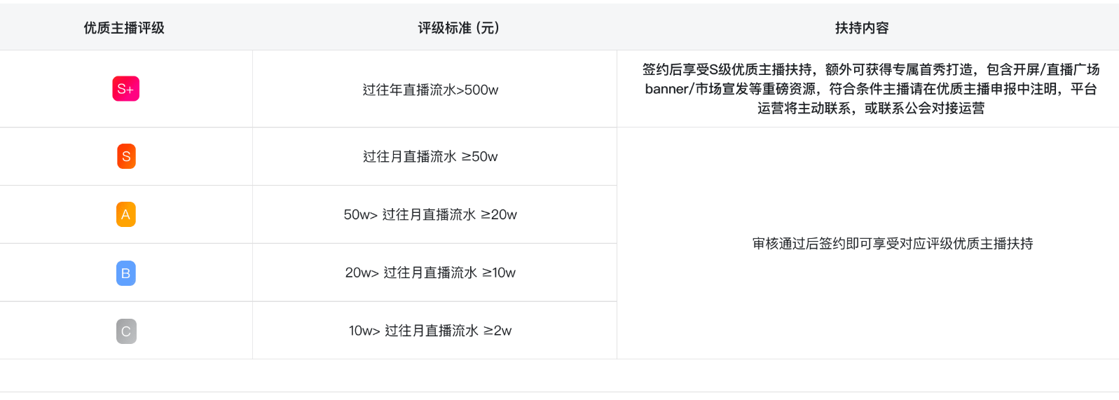 通过审核的优质主播完成签约后,主播以及主播所属公会将获得对应评级的优质主播扶持。主播可获得超热流量扶持以及长达60日每日流量扶持帮助主播快速发展;公会可获得6个自然月,更高20%主播流水的公会奖金,同时优质主播流水参与公会流水任务收益计算。主播需在审核通过后第2月的月底前完成签约,否则将过期,签约后不再享受扶持