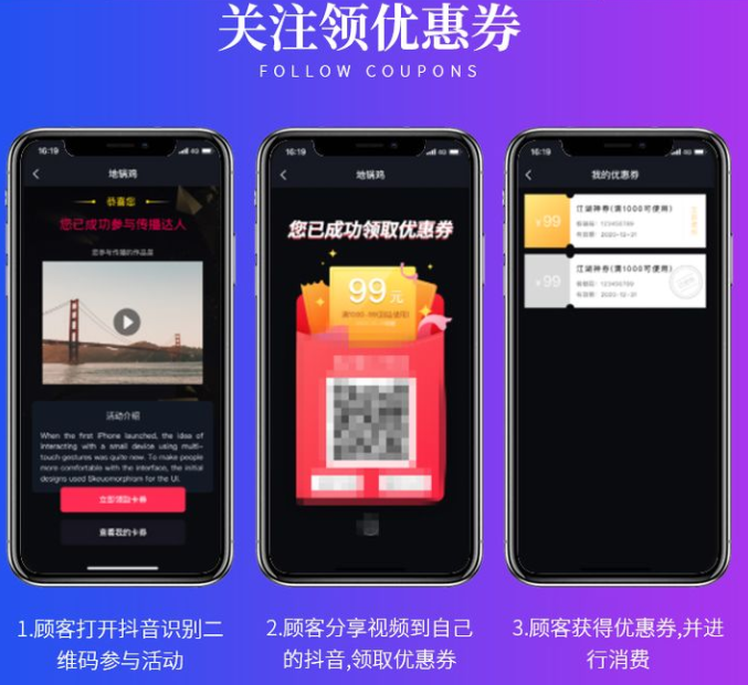 抖音同城爆店码平台模式:店铺推广视频、卡券集合生成爆店码,可下载打印成海报,商家引导顾客抖音扫码即可参与活动,领取优惠卡券并帮商家转发视频到抖音上。而转发后的视频需要跟平时自己直接发的模式一样,带有标题、可@等。