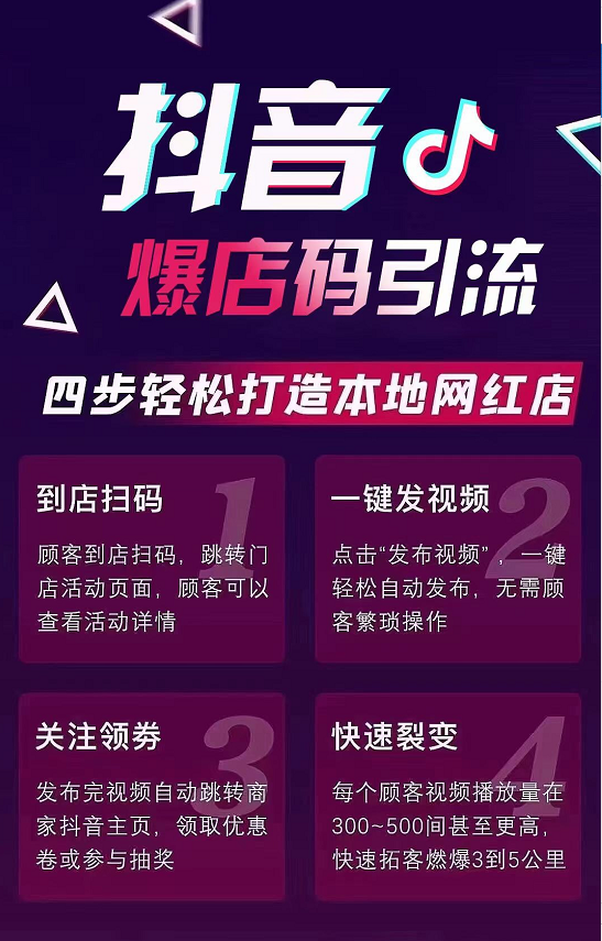 抖音同城爆店码的过程是为商家生成二维码,制作视频,放入二维码中。商家引导顾客扫描二维码,顾客扫描二维码后统一授权,触发两个动作,一个是帮商家转发视频,一个是关注商家抖音号。一个人转发500张基本流量曝光,1000人50w曝光,那么我们加的定位就成了大概率的热点,我们创造的话题也成了大概率的热点。