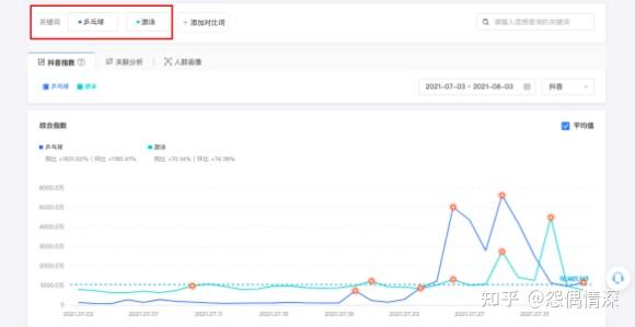 以“乒乓球”为例,搜索乒乓球,你会看到该词在相关平台的指数趋势、关联分析、人群画像等,你也可以添加品牌对比词,从而查看不同的热词之间的指数变化,从而帮助品牌主实时掌握热点趋势,把握竞品的行业动态。