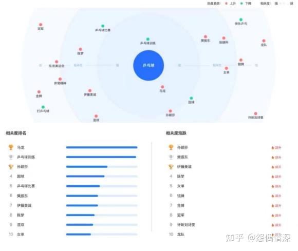 另外在关联分析的板块中,你也可以清晰的看到与乒乓球相关的热词,比如马龙、乒乓球训练等,底部还有相关度排名,帮助你了解乒乓球一词背后的关联和逻辑。