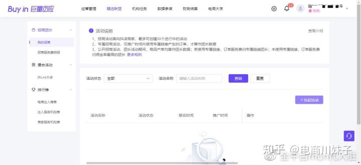 •MCN机构/基地,绑定达人的小店交易额汇总>=100W,即可开通团长权限。•有相关的团长经验,比如在淘宝、京东、快手有一定的招商经验,可以上传截图•如果不满足绑定达人小店GMV门槛,也没有相关团长经验,则提供相关公司介绍,主营业务模式,相关达人和商家资源,成功案例等。在完成所有的账户开通后,团长可以发起招商活动,在巨量百应后台,【精选联盟】-【招商团长】-【我的招商】,发起招商活动。