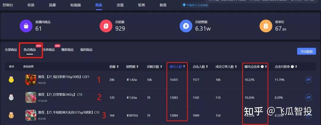 (数据来源:飞瓜智投,数据已获客户授权并脱敏处理)除了观众点菜的方式,直播运营还可以从【热点商品】,查看每个商品曝光人数和曝光点击率来查看不同商品的曝光和转化情况。