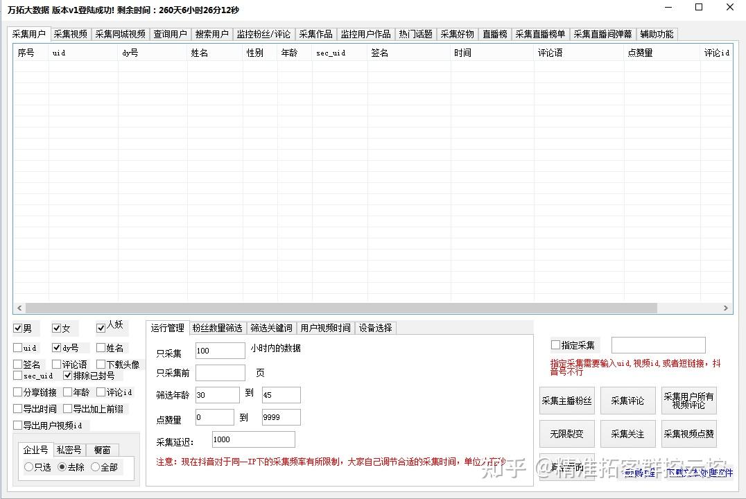 3. 同行的粉丝列表可以全部进行采集,UID,抖音号,性别,年龄等自动筛选。