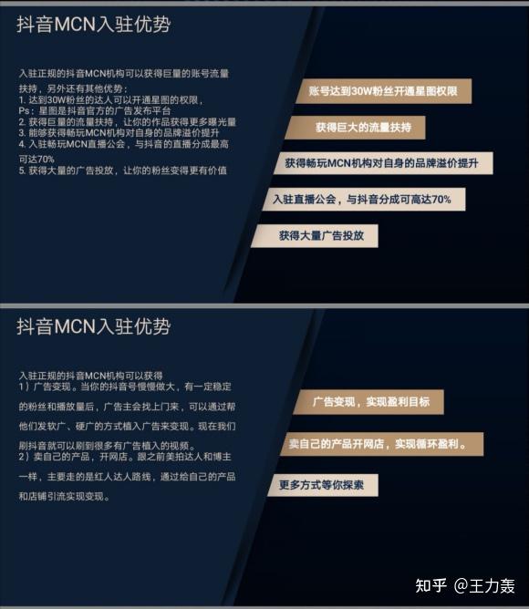 https://xg.zhihu.com/plugin/97716e1de45fc241a8b466145303214e?BIZ=ECOMMERCE除此之外,抖音MCN机构的商业变现能力非常强,如果你是商家,你想要在抖音做带货推广,肯定要找有着无数达人网红矩阵的专业MCN机构合作,无论是从内容上还是流量上,抖音MCN机构有着天然的竞争优势。