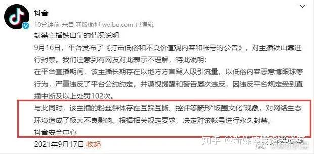 所以他们对抖音官方提出质询,也迎来了回应。据抖音官方表示,铁山靠“长期存在以地方方言骂人吸引流量、以低俗内容恶意博眼球等行为”,同时“该主播的粉丝团体存在互踩互撕、控评等畸形文化,对网络生态环境造成了极大不良影响。”