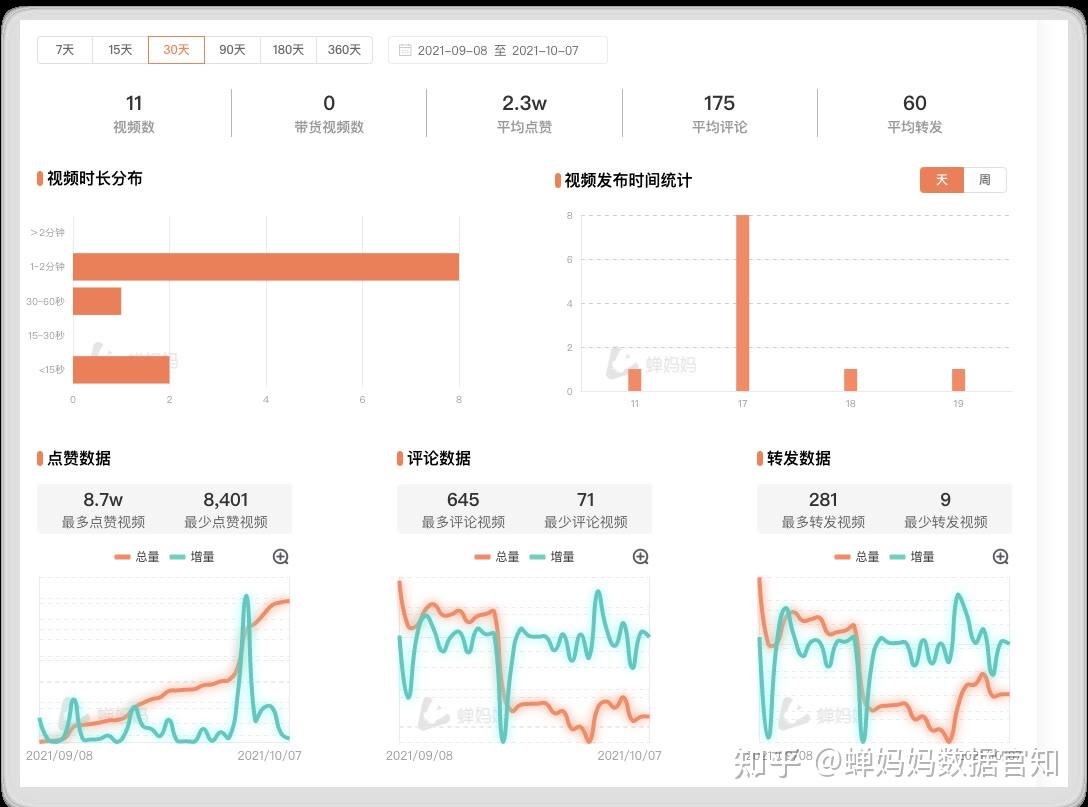 30天的视频表现1.总共发布了11个视频,平均点赞2.3万个,评论数175个,平均转发60次。