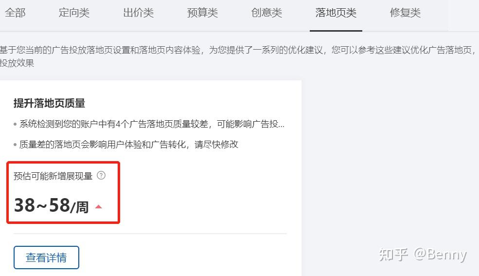 但是如果数据较高,且质量较差的落地页增多,那就还是要点击这个“查看详情”进去看看具体是什么词、什么创意对应的落地页比较差,质量差的原因是什么,根据系统提示来进行修改。