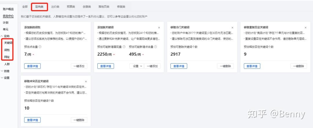 定向类有 系统推荐的词包、推荐的新关键词、移除冷门关键词、移除重复否定关键词、移除冲突否定关键词等: