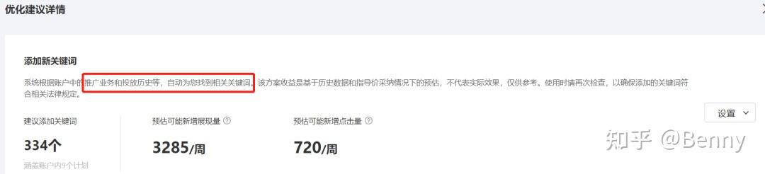 03 对于关键词类,系统给出的建议一般该如何选择呢?我的标准是看“预估数据”。如果“预估数据”对账户数据的影响较大,那我会积极地采纳。比如:上图中“添加关键词”部分相对来说,系统预估的周数据较大,那么参考的意义就会比较大;如果“预估数据”较小,则不强求,可采纳也可忽略。
