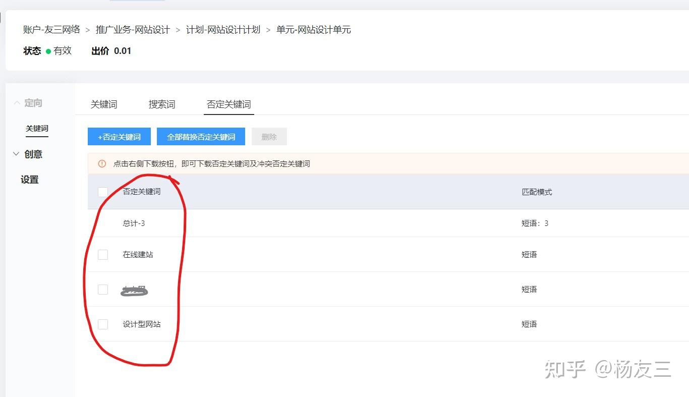 在“否定关键词”页面,我们可以看到被否定的关键词。只有我们把不相关的搜索词都添加到这里,公司才能少花冤枉钱。