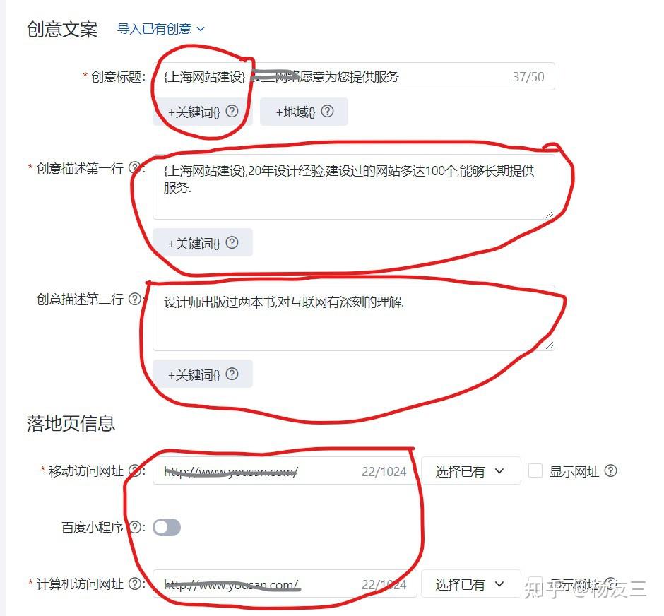 如果在某个地域推广(不在全国推广),可以在“创意标题”中直接在{}里把地域标识出来。反正我添加的每个关键词都带地域。到真正推广的时候,当客户(公司推广地域的客户,例如上海)搜不带地域的关键词时,例如“网站建设”,百度也会把公司的广告展现出来。