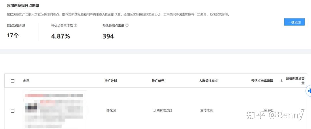 04 那优化中心给的创意的建议要不要采纳呢?众所周知,大多数的同行之间的创意相差不是很大,除非真的有极少优化师把创意写的很有亮点。那么影响点击率的主要因素其实还是关键词的排名。如果在不需要提高出价的情况下,预估点击率能增4.87%,我觉得这个数据还是很OK的,即使达不到这个增幅,加了对我又没有损失,不加白不加啊!不过,还是先查看一下,系统推荐的创意没什么问题的话,再果断一键添加。