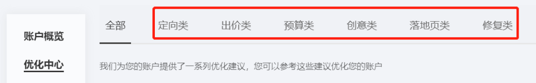 02 其次,“优化中心”怎么用呢?我通常使用比较多的部分是定向类、创意类和落地页类,这是长期优化的部分。