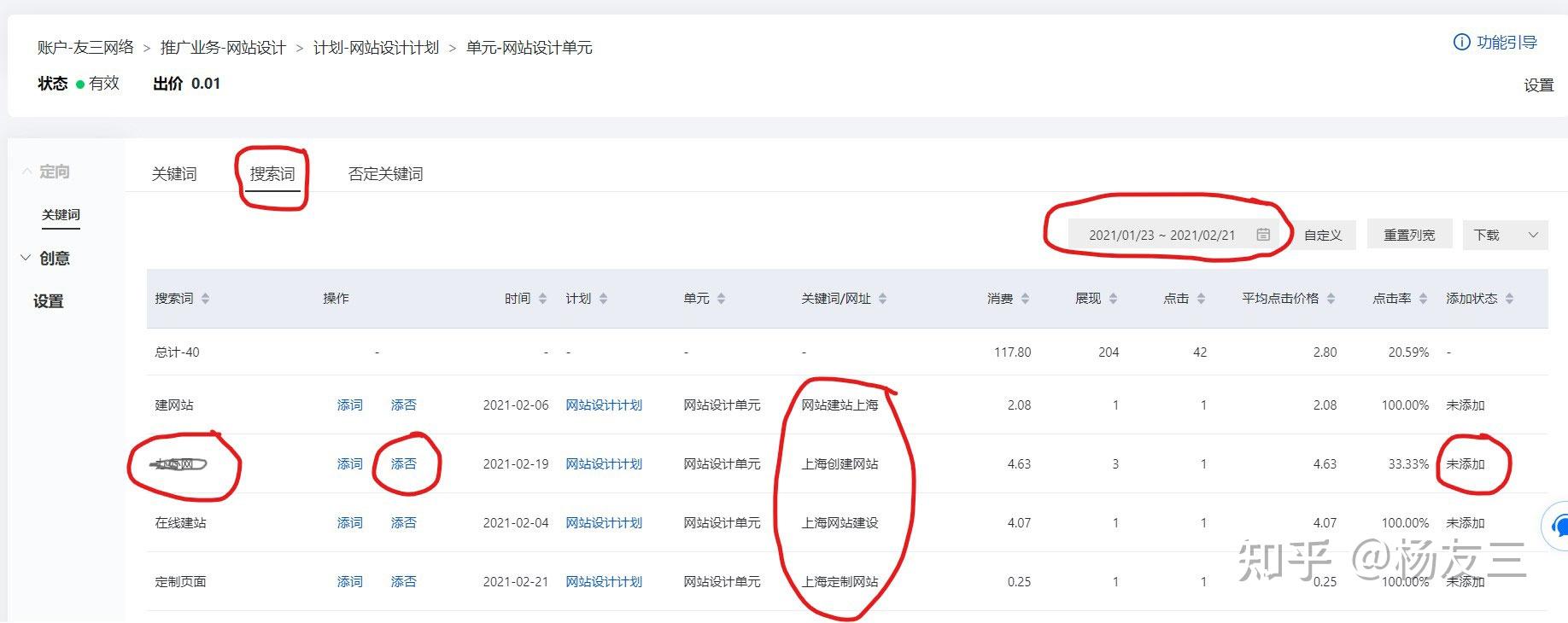 当然,百度的人工智能还是会有漏洞。例如,有的“搜索词”完全不在公司的业务范围内,这时你就要将它添加到“否定关键词”中,只要点击“添否”按钮就行了。