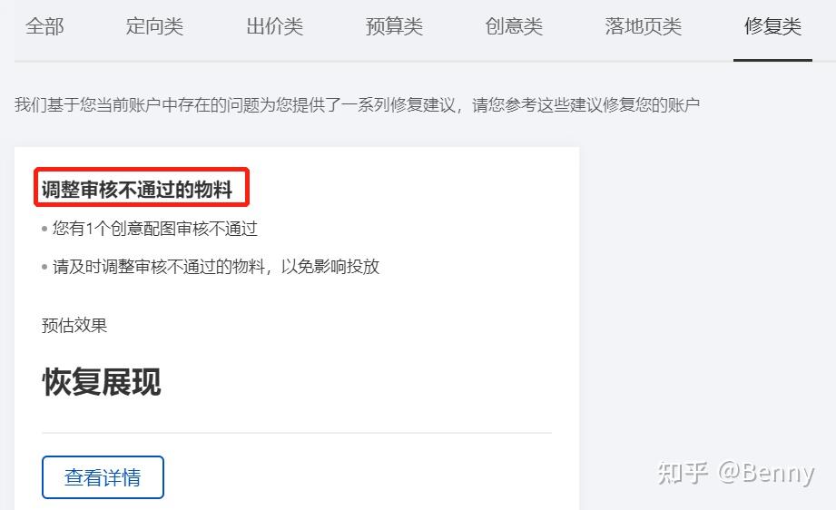 修复类,包括关键词,创意和配图等审核情况,系统中有审核不过的物料会在这里提醒,及时修改就能恢复正常了。