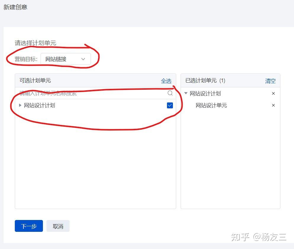营销目标选择默认值“网站链接”就行了。之后勾选计划,点击“下一步”按钮,就进入到了“创意”页面。