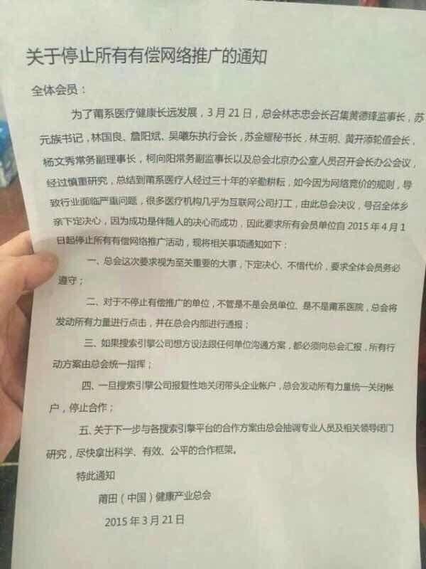 当时,莆田(中国)健康产业总会发出一份《关于停止所有有偿网络推广的通知》,要求所有会员单位自 4 月 1 日起停止所有有偿网络推广活动。因为百度对“莆田系”医院越来越严格的上线政策,导致“莆田系”很多医院无法再在百度上进行推广。这份通知称: