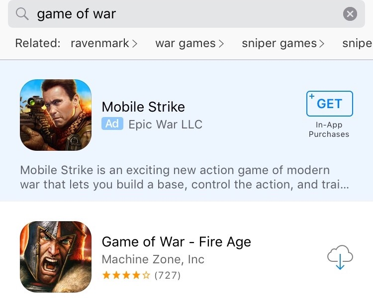 在某宝直通车上研究各种黑车技术的小伙伴们,即将在新的领域开辟自己的战场啦 阿里做了这么多年的竞价排名推广,从业人员不知道有多少逐步更新的黑技术,苹果能不能hold住啊竞价排名没有那么不好,不竞价排名又怎么排呢?是靠下载次数还是好评数?我是不是可以开个公司帮你刷这些数据呢?适当就好不要纠结。App Store 搜索广告在美国区已经开了一小段时间了,有不少的 App 开发者都已经抢先做了广告投放的实验。投放的基本原理是依据关键词买 CPT(T 是 Tap 的意思,其实就是 CPC),和 Google AdWords 中的概念和操作类似。从我个人投放和其他人公开的投放数据来看,CPC 价格在 $0.05 - $0.2 左右,如果按照 20% 的下载转化率来计算的话,一个激活(CPA)差不多是 $0.25 - $1,鉴于美国区 iOS 用户质量颇高,少于 1 美元的单用户获取成本是很很很划算的。当然,这样低的成本与搜索广告刚开张不久相关,没有多少人竞价,自然随便给点就能捞到用户。那么在这个时期,会出现什么样的情况,对于 App 开发者来说能做哪些事情呢?我觉得主要有以下三点,分情况描述:免费应用(意思是赚钱较少的非游戏类应用)。这类应用如果以获取大量用户为目标的话,应该马上跟进搜索广告,特别是那些本身就吸量的应用(比如照片编辑美化类工具),用户自然搜索本来就多,设置一个相对较低的 CPC 价格,就能以低成本获取到大量相关用户。付费应用和付费游戏。这类 App 本身下载购买是需要付费的,如果能够以低于自身价格的成本获取到一个用户,那依然是赚了。比如说,卖 $2.99,CPA 成本算下来只有 $1.5,苹果分成后 $2.99 * 0.7 > $1.5 那完全可以采取买量策略,这样一来不亏钱,二来增长了付费下载量,可以间接提升在榜单的排名,从而拿到更多的榜单自然量。免费游戏+内购付费。游戏靠内购赚钱的模式已经很普遍了,看看畅销排行榜就知道,基本上全是这类游戏,它们其实也应该是最适合做搜索广告投放的。为什么这么说,首先免费下载,所以下载转化率要明显高于上述的第二类付费下载,在关键词竞价上有优势;其次游戏本身平均 LTV 价值远高于上述类免费应用,所以 CPT 出价有优势。两个优势结合在一起+现在搜索广告的价值洼地,这不就是“透明低价的刷关键词”机会么?当然,搜索广告投放不会那么傻瓜式地简单,一上来就有很好的结果。有一定的策略是需要了解和把握的:出价(Bid)太低就不会有展示(Impression)。比如可以 $0.01 挂着,但十有八九你会得到 0 展示。简单说就是和广告的“质量分”相关,出价高你才有机会。Bid 不是最终的 CPT 价格,head room 可以到 50% 甚至更多,建议从 $0.4 左右往上试。对做流量有把握的,可以蹭“Facebook”,“Youtube”这些热词。没把握的,老老实实地用和产品相关的关键词,然后设置关键词匹配为“broad match”,这样投放有结果之后还能看到苹果通过系统拓展的关键词是哪些,包括详细的展示、点击、转化等数据,方便自己对 ASO 关键词做调整。公司有矩阵产品,比如一个公司多款游戏,或者一个游戏多个系列的,可以利用搜索广告做交叉推广(cross promotion)。一方面通过搜索广告占住广告位防止被恶意抢占,另外一方面,避免了位的广告 App 和 第二位的自家 App 重复,浪费展示机会。下面的例子就是 MZ 在“game of war”关键词下交叉推广自家的“Mobile Strike”游戏。