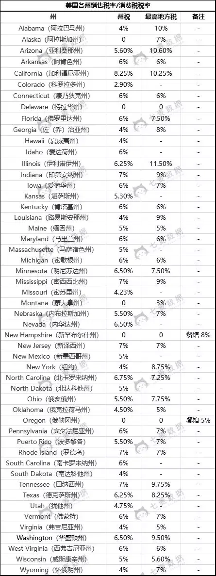 可申请免税,若无免税需按以下各州税收标准缴税。