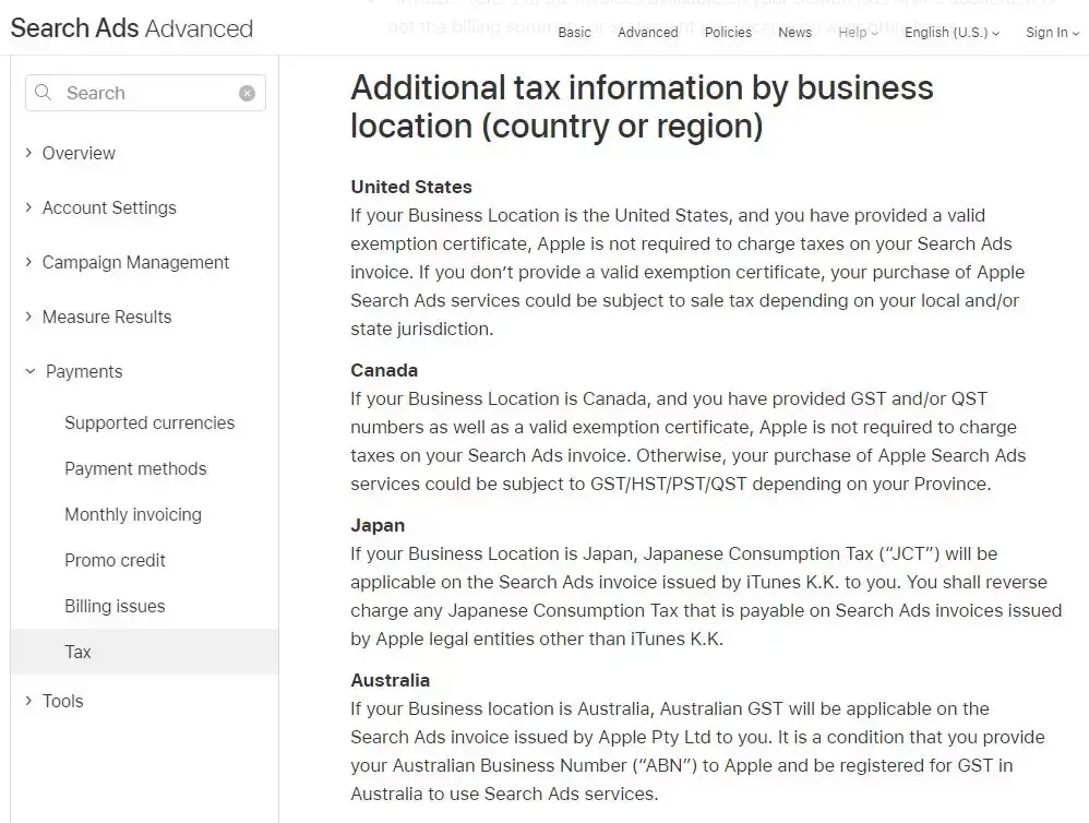 2018 年 8 月 1 日苹果向 Search Ads 用户宣布包括美国、加拿大、日本、澳大利亚等在内的部分/地区的搜索广告服务需要缴税。