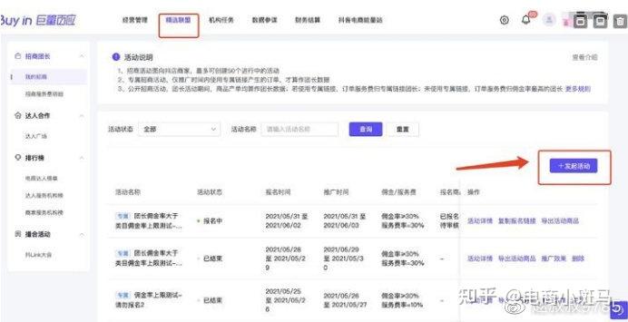 •MCN机构/基地,绑定达人的小店交易额汇总>=100W,即可开通团长权限。•有相关的团长经验,比如在淘宝、京东、快手有一定的招商经验,可以上传截图•如果不满足绑定达人小店GMV门槛,也没有相关团长经验,则提供相关公司介绍,主营业务模式,相关达人和商家资源,成功案例等。.......知乎营销平台在完成所有的账户开通后,团长可以发起招商活动,在巨量百应后台,【精选联盟】-【招商团长】-【我的招商】,发起招商活动。