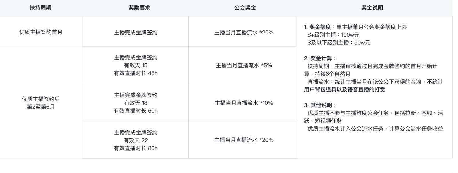 对于公会引入的优质主播,我们希望公会投入更多的精力为主播提供更好的服务与运营,帮助主播发展成长,主播签约后对应的公会可获得主播6个月20%流水的奖金;同时优质主播流水直接参与公会流水任务计算