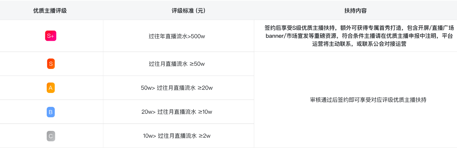 平台将根据主播综合素质水平及参考主播过往直播流水(S+需为近24月内表现,S、A、B需为近3月内表现)进行评级,签约后可匹配相应的扶持资源。