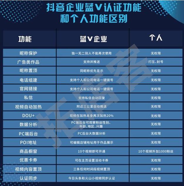 开通抖音蓝V1:发营销类视频不仅不会被评级打压限流,还会进行精准推送; 2:蓝V标志专属,名称具有性,在搜索排名置顶、优先显示; 3:专属商品展示栏,即商家页面,可以展示商品菜单和在线预约; 4:视频下方可以挂团购链接,观客变顾客,实现用户边看边买; 5:POI专属地址定位,可以一键导航,系统以此为中心推送周边一片的流量; 个人觉得这几点是很重要的,还有其他一些大家参考下以下这张图
