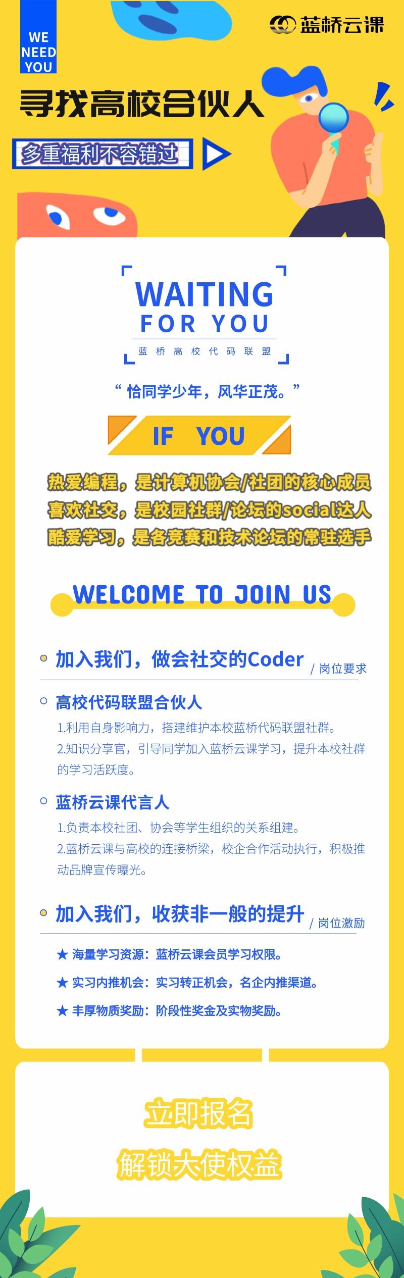 如果你是在校大学生/研究生,同时热爱学习/热爱编程/喜欢社交,或者想锻炼这些方面的能力和技能,那么欢迎你加入我们成为蓝桥高校合伙人的一员~