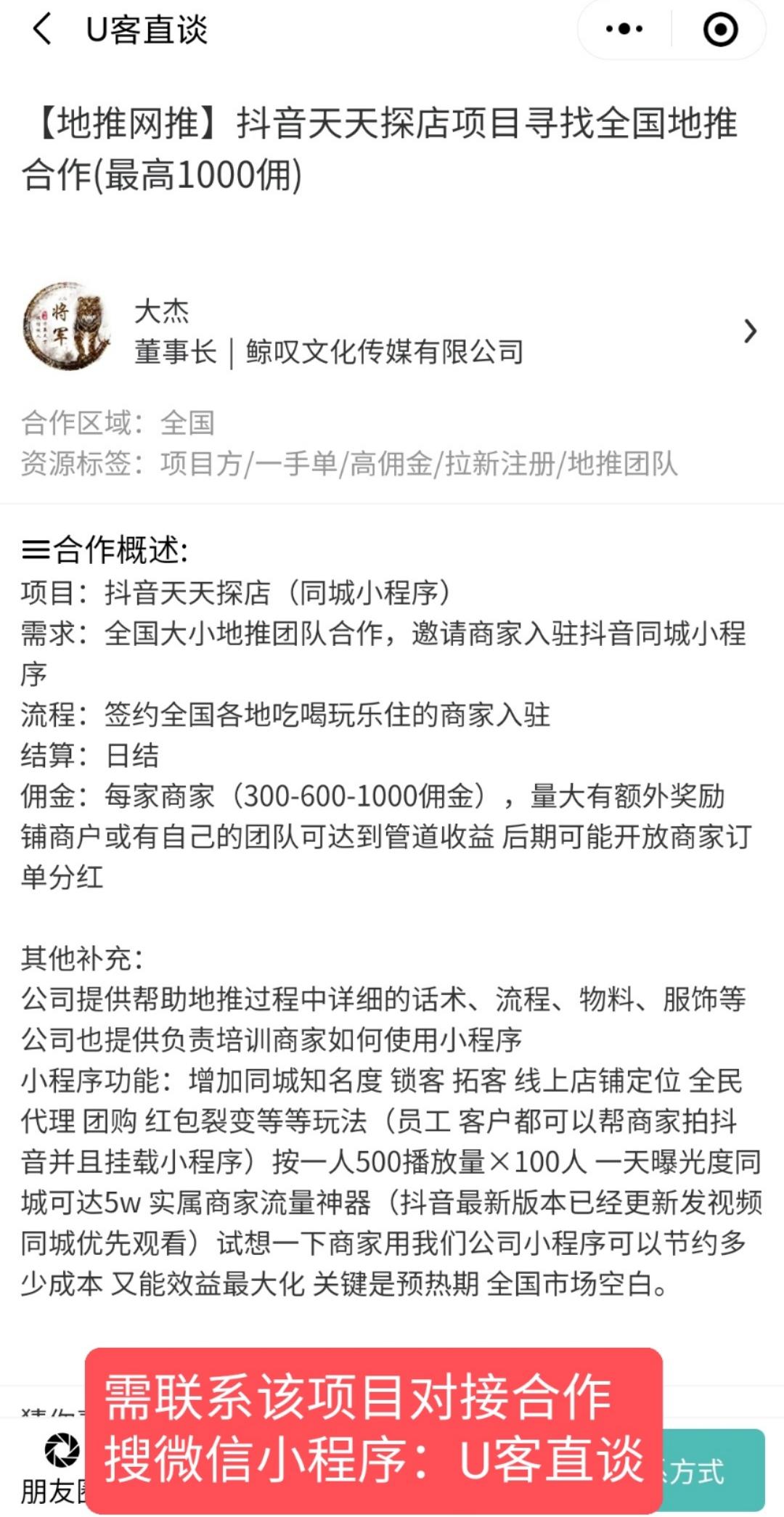 抖音天天探店小程序地推项目现在还是很火的,签约全国各地吃喝玩乐的商家,即可获得佣金更高1000,很多地推现在都在推这个项目。需要对接联系该项目可以搜索微信小程序:U客直谈