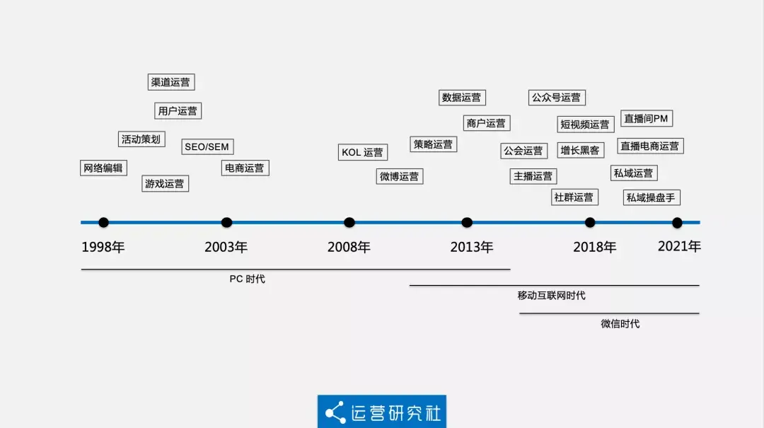运营的作用越来越大:站在今天,大家应该庆幸,相比起 20 多年前,运营的作用已经越来越重要了。在早期的 PC 时代,没有什么运营岗位,甚至没有运营的概念。到后来,运营承担的更多是打辅助的角色,例如帮助更新网站信息、帮助产品做搜索优化。而到今天,运营变成了企业的核心竞争力。