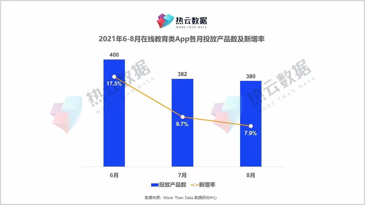热云数据通过对2021年6-8月在线教育各细分领域投放产品数占比进行分析发现,成人教育/职业培训以优势排在位,投放产品数占比接近50%,语言培训、启蒙教育处于第二梯队,占比在10%以上,素质教育、K12和综合类位列第三梯队。结合2021年6-8月在线教育类App各月投放产品数及新增率来看,6月投放产品数达400个,新增率超过15%,无论在投放产品数上还是在新增率上都达到了全年买量峰值。整体上看,6-8月呈逐步递减趋势。
