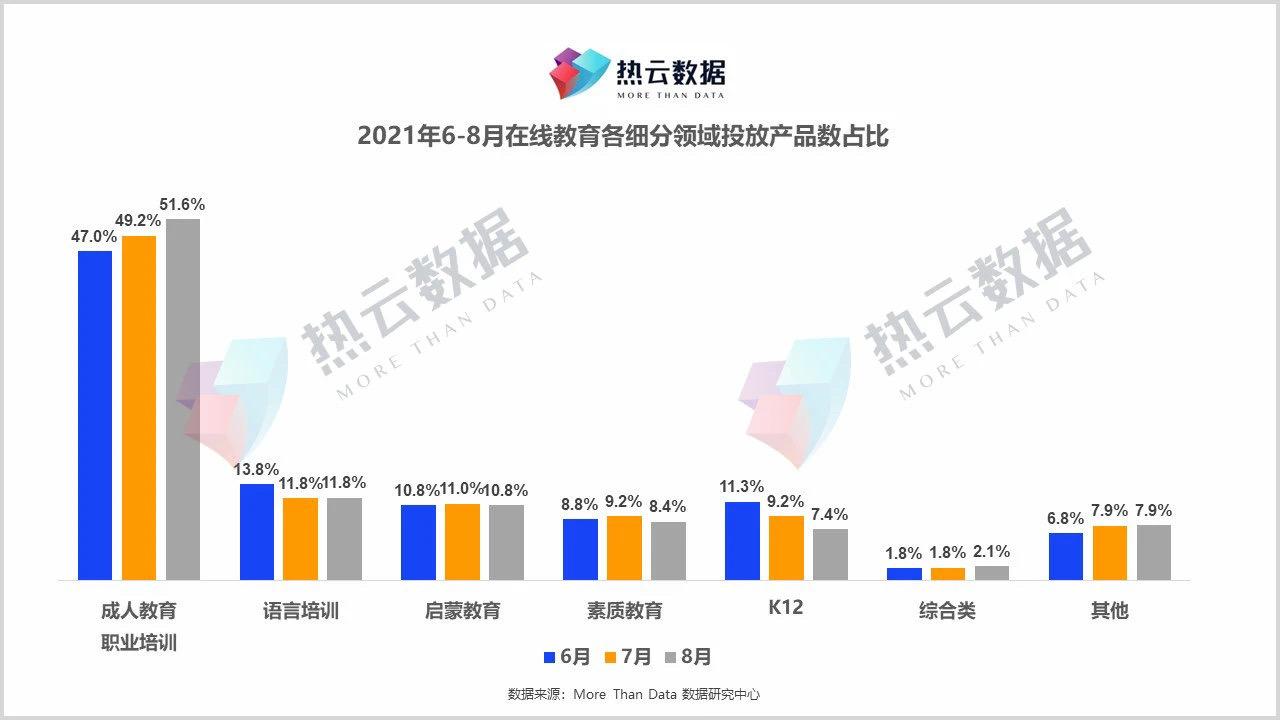 热云数据整理了2021年8月在线教育热门细分赛道重点投放领域,以下是具体内容: