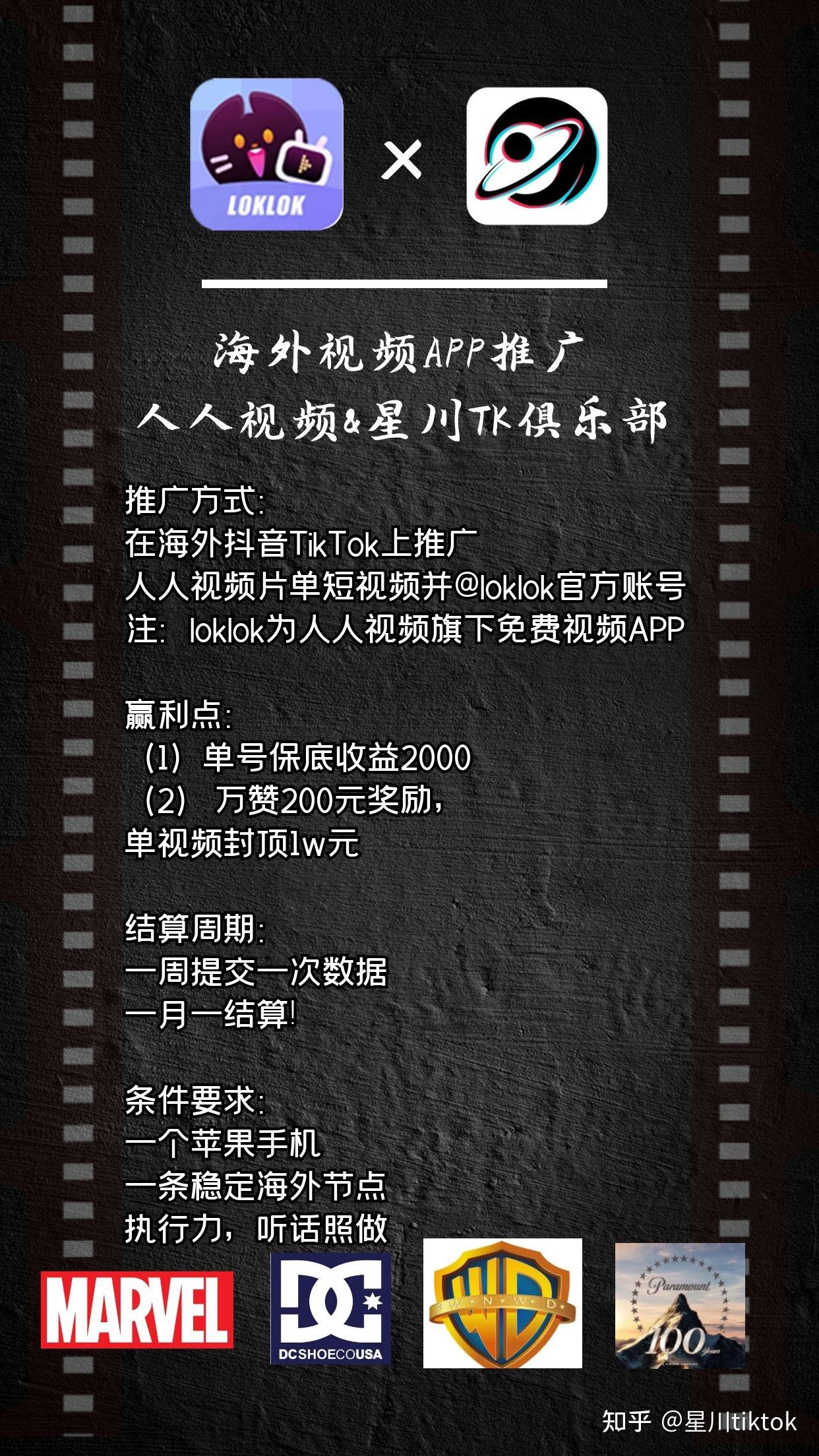 二:人人视频旗下&LokLok这个项目是什么情况?怎么操作呢?项目介绍:七月份的时候人人影视的推广负责人就找到我让我了解到这个事儿,并且邀请我合作推广,因为国内对影视剪辑行业的版权问题抓到非常严,人人也开始转型并瞄准了海外,推出的出海项目叫做LOKLOK,是一个影视APP,并打算在TIKTOK上做推广,并按一定的规则给推广者结算佣金。