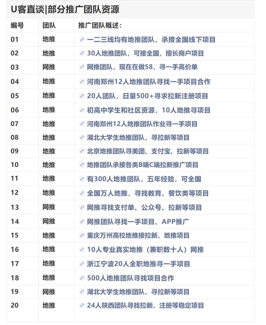 以上是U客直谈平台里地推团队方自行发布的部分资源。题主可以看看,也可以直接在平台免费发布你的合作信息。比如你有什么项目,需要什么地方或者多少人数的推广人员。