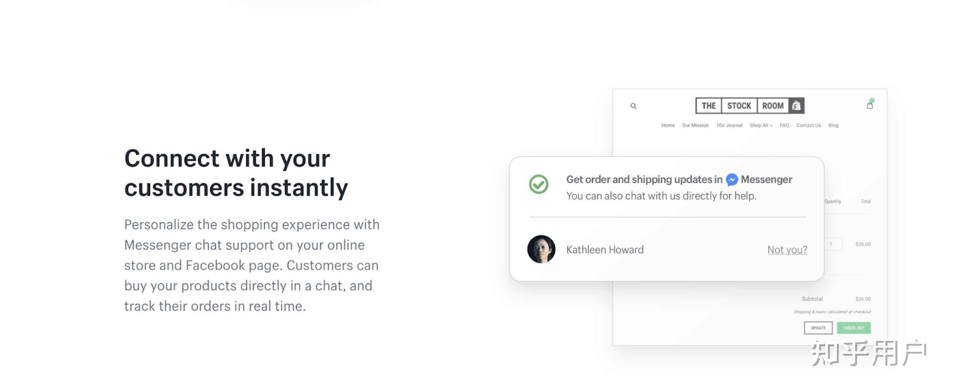 与客户联系并通过 Facebook Messenger 进行销售如果你选择稍便宜的Shopify Lite版本,那么你将获得包含 Facebook Messenger 的实时聊天模块。这是一个很棒的额外功能,因为它为企业提供了一种在需要时与客户联系的方式。