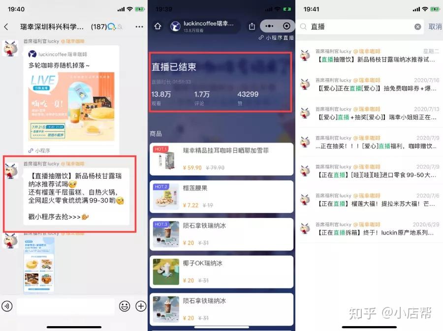 三、瑞幸企业微信与小程序直播结合瑞幸真的把私域流量用到了,从自有私域流量引流到企微,再用企微群带动小程序直播卖货。