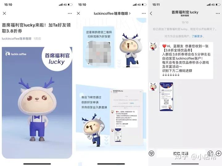 02 公众号发文引导用户加企微号并进群之前瑞幸官方微信公众号上发表了一篇文章《首席福利官lucky来啦!加Ta好友领取3.8折券》,这篇文章放了企业微信的二维码,扫码加好友进群之后可以领取3.8折券。我扫码加好友后弹出自动打招呼语,以及引导进群的海报。