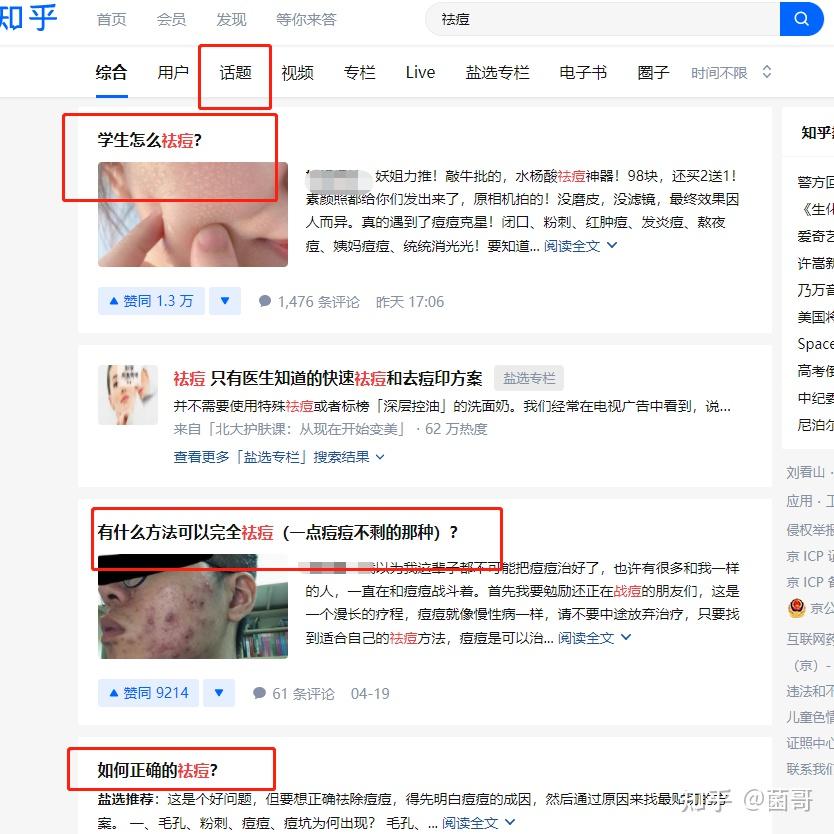 常见的,我们是出售护肤品的,我们就可以去到搜索框,搜索护肤,祛痘相关关键词,就会出现相关的问题,及话题,我们可以去话题里面找问题,也可以筛选有价值的问题进行回答即可。