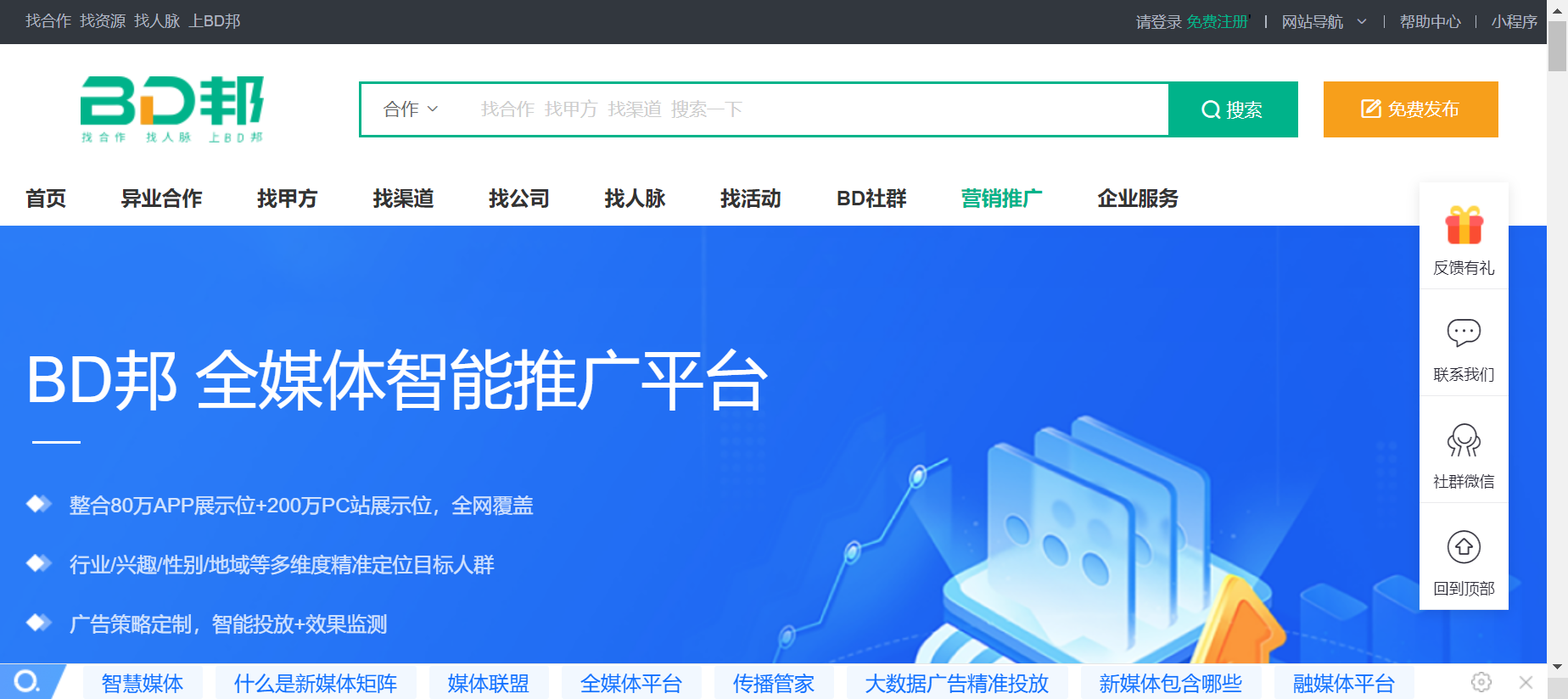 对于推广渠道,当前有微信、QQ、微博、头条、网站,除了以上几种外,还有很多匹配不同行业以及不同形式的流量平台,比如抖音、快手、小红书、知乎、贴吧、简书、豆瓣、闲鱼、喜马拉雅FM等等。除此之外我们BD邦平台上(www.bd.cn )上也有一个全媒体智能推广平台,