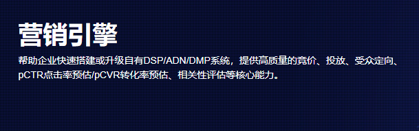 珍岛全网营销引擎极可以速搭建营销系统,1人2天极速搭建企业自有营销系统;拥有超强ID Mapping,跨屏跨域ID高识别率,提升流量转化效率;融合珍岛大数据,融合高德大数据,助力精准营销;能进行点击率/转化率预估,pCTR/pCVR结合珍岛大数据能力,带来营销效果全面升级。