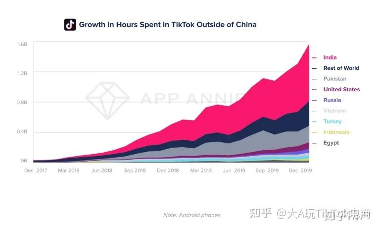 知乎营销平台TikTok用户主要在南亚,印度是头部市场,TikTok1/3的装机都来自印度。下面是中国以外的&地区在TikTok的使用时长,红色的就是印度。