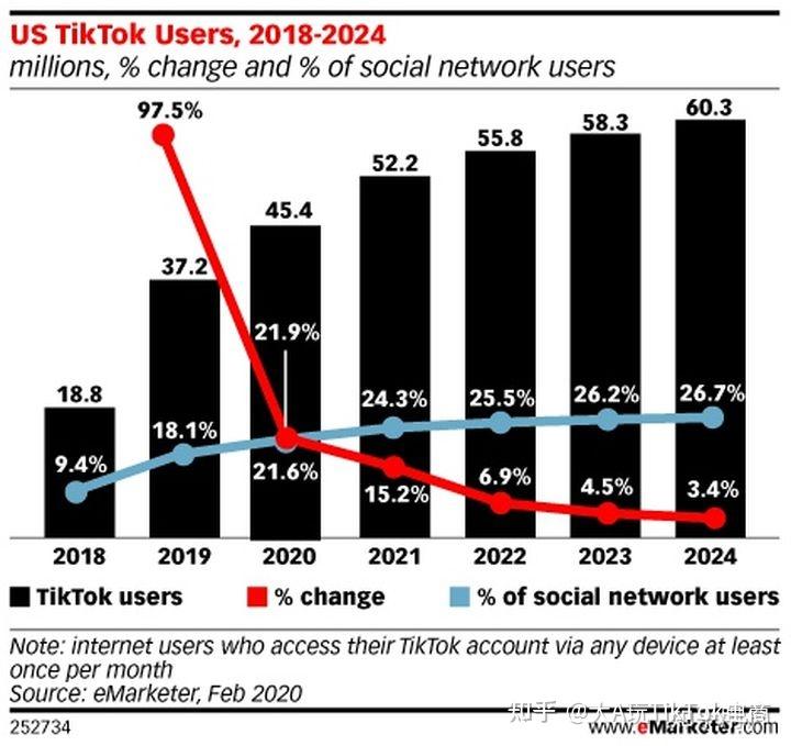 据emarketer数据显示,TikTok在美国的月活跃用户在2020将增长21.9%,约4540万人。到2021年,这一数据将超过5000万人。继2019增长了97.5%后,动态的短视频平台吸引了发非常多的用户,尤其是青少年和儿童。在2019年,21.6%的美国社交网络用户(即五分之一以上)每个月至少使用一次TikTok。