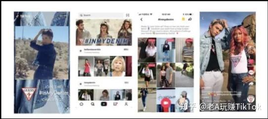 广告特点(1)时长:3-4s(2)位置:app打开时立即显示,"For You"页面(3)展示:竖立、满屏(4)方式:静态图片、GIF或视频,提供可跳转品牌tag或品牌网站链接放置(5)用户每天只能看到一个Branded Take-over广告,这意味着竞争相对较少。2. 广告案例Guess Jeans在TikTok上宣传#In-MyDenim Challenge的例子。下面最左边的照片是Brand Takeover。