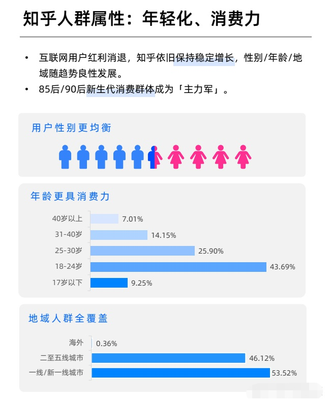 回想身边的人,敢于消费的群体,撇开经济实力外,80.90后这代年轻人,消费理念“当仁不让”,而知乎用户中的4.2亿万用户当中,有90%都是以18-45岁以下的活力群体组成,具有高学历、高收入,高消费的特性。那么,在知乎投放广告,只要内容足够好产品足够好,还担心转化吗?