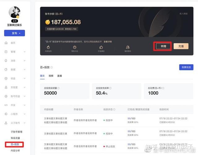 父账号充值后,可直接为旗下的子账号的内容进行投放。已投放的内容可在“资产”-“百+”中的数据详情页查看投放效果。