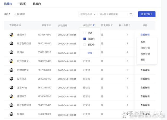父账号可以点击“已签约”、“待解约”、“已解约”来查看不同关联状态下的账号列表。并且支持“导出数据”将相关账号列表导出。“已签约”列表支持筛选和排序,可以快速便捷的查看作者的关联状态、是否原创等,帮助矩阵运营者快速了解子账号运营情况。