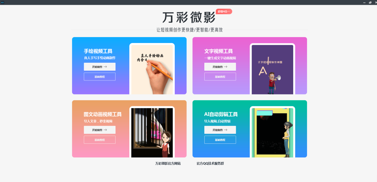 软件目前有四大模块,手绘视频、文字视频、图文视频以及AI自动剪辑工具。