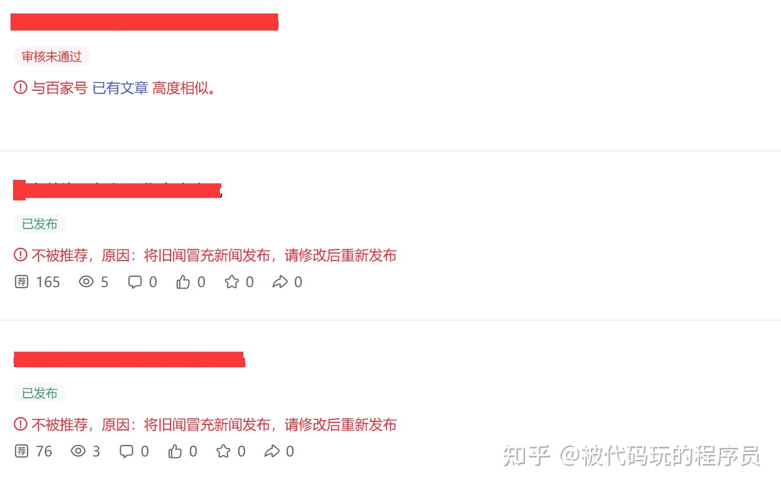 可能这也是百家号单价高的原因,百家号审核非常严格,不管是视频、文章,重复度高的不会被推荐,甚至审核不通过。